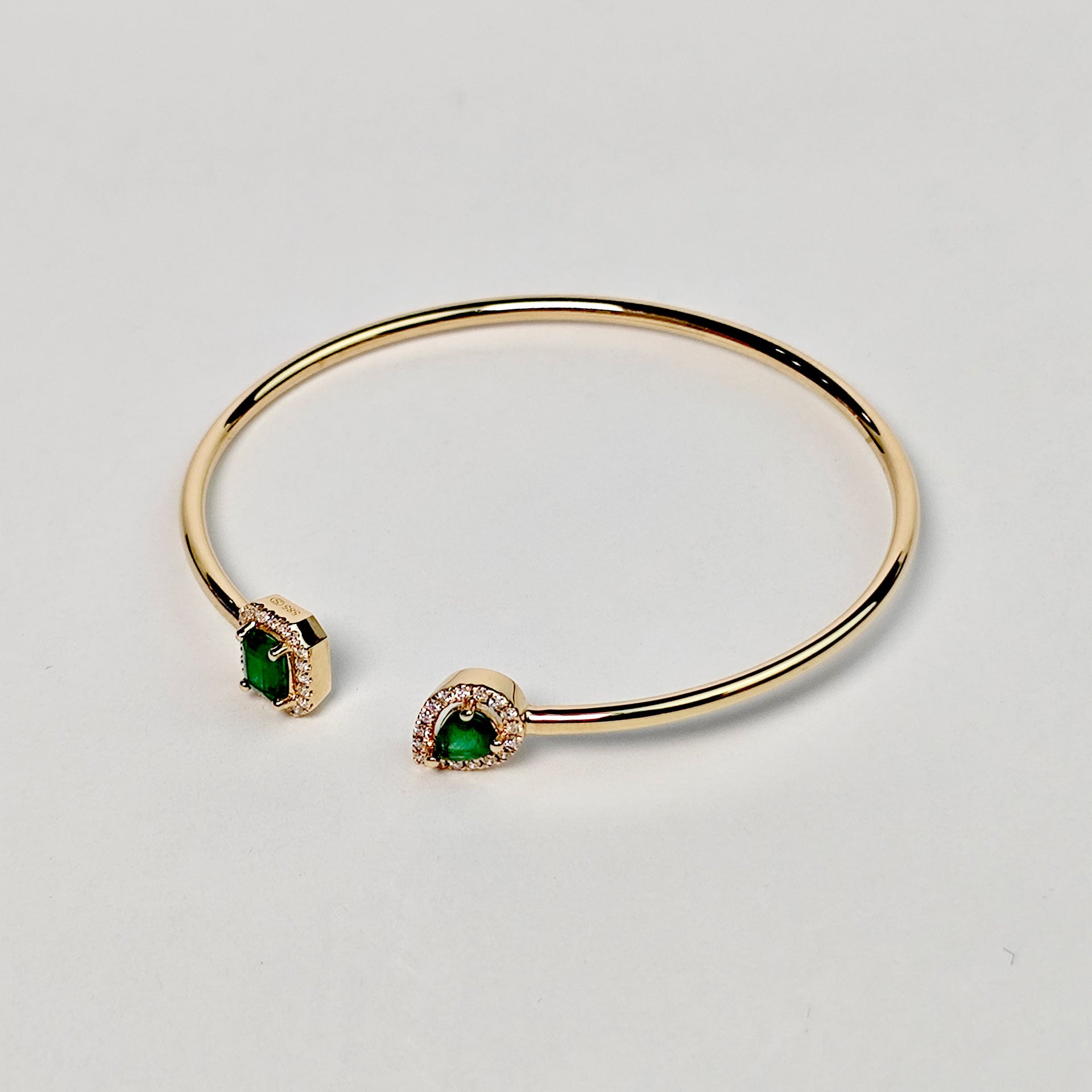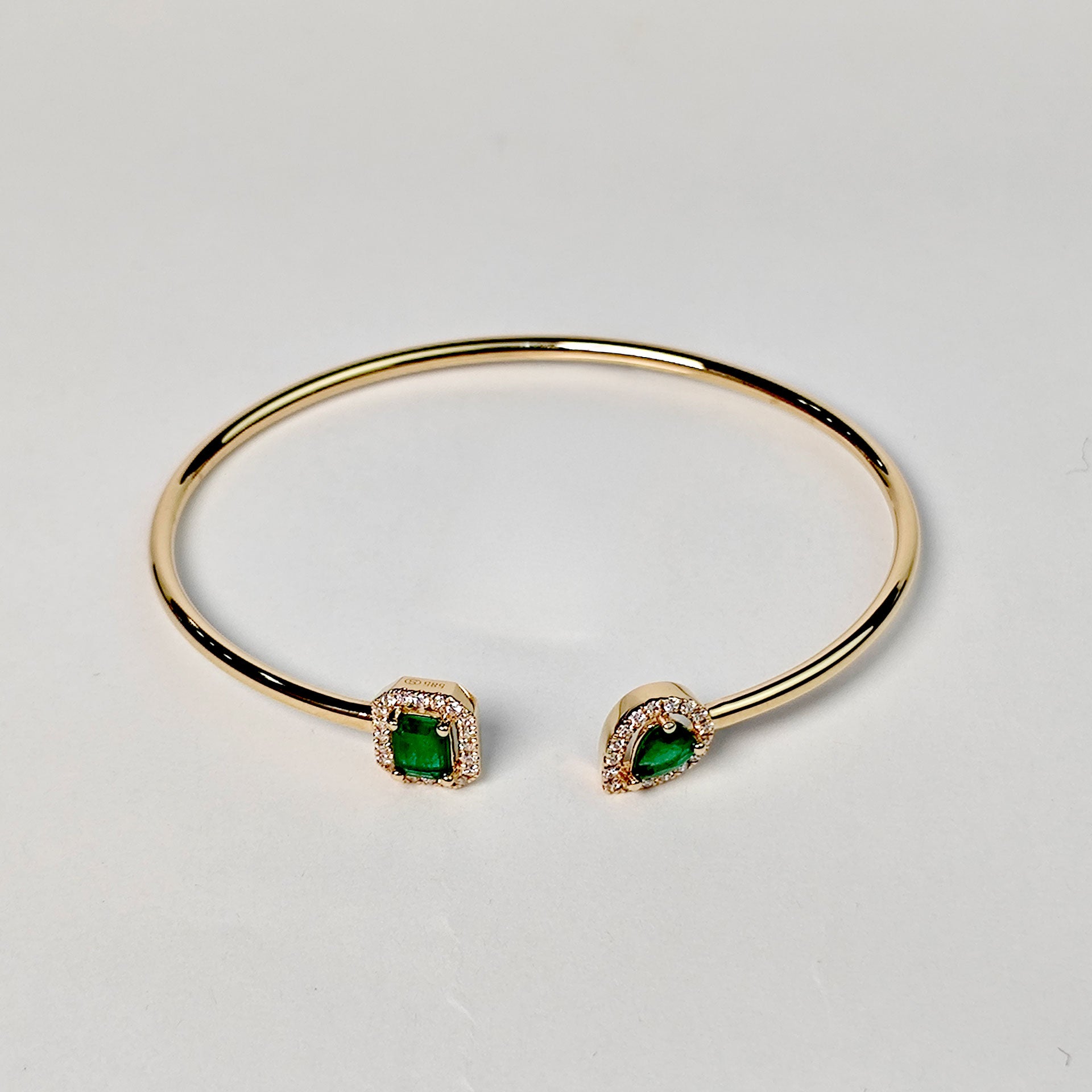Piezas que cuentan historias. Este brazalete combina una composición de esmeraldas en corte cuadro y gota con 37 diamantes, todo en oro 14K para un resultado clásico pero con carácter. Perfecto para ocasiones donde quieres impresionar.